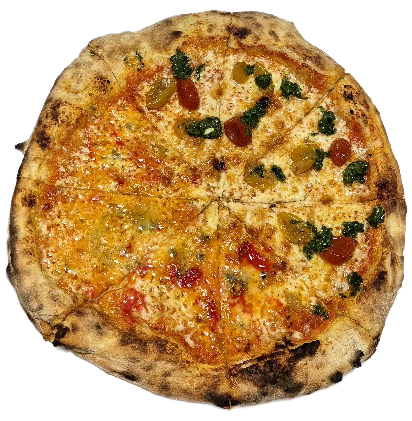 Pizza de dois sabores com massa de fermentação natural da Pizzaria Casa da BarraMonte a sua Pizza