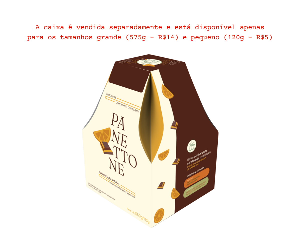 Panetone de fermentação natural, com massa feita a partir de suco de laranjas orgânicas e aromatizada com mel especial, raspas de cítricos e cumaru (baunilha amazônica). É recheado com chocolate nobre 40%, chocolate de origem 63% e laranjas confitadas. Possui cobertura contendo glaçagem de amendoim com cacau em pó e açúcar perolado.